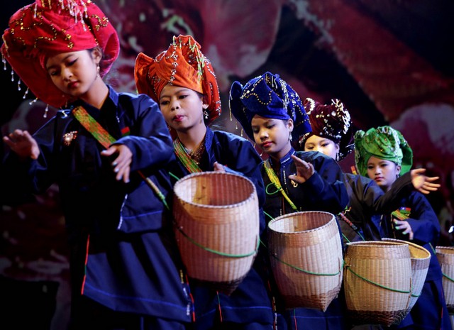 کودکان برمه ای در حال اجرای یک نمایش سنتی در شصت و هفتمین سالگرد روز ملی شان