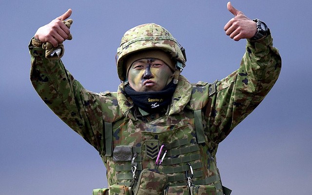 یک نیروی ارتش ژاپن در مانور مشترک با نیروهای آمریکایی در پایگاهی نظامی در کالیفرنیا