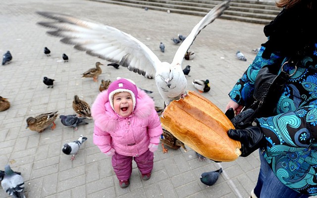 نان دادن به پرنده ها در میدان مرکزی شهر مینسک بلاروس
