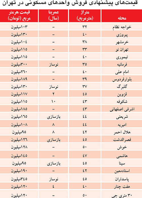 از سوی دیگر در خیابان محبوب مجاز (سینا) 2 واحد مسکونی به متراژهای 45 و 35 متری با قیمتهای 95 میلیون و 87 میلیون تومان به بازار برای فروش اعلام شده است. این دو واحد 16 سال ساخت هستند.