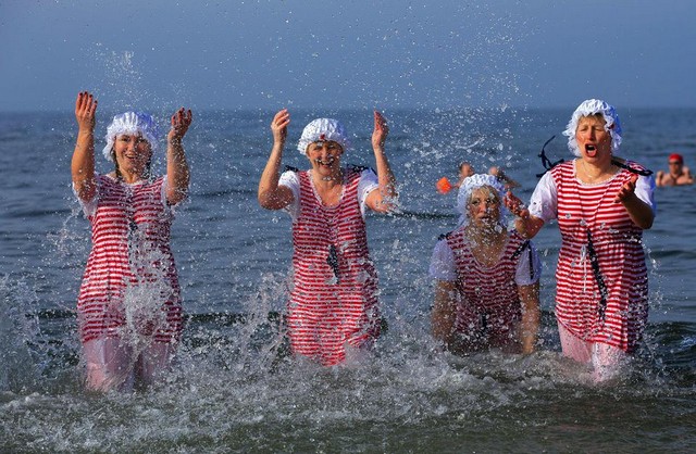 زنان عضو گروه آب تنی در یخ در ساحل دریای بالتیک آلمان