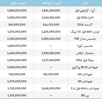جدیدترین قیمت انواع خودروهای هیوندای در بازار و نمایندگی های رسمی این شرکت منتشر شد. به گزارش باشگاه خبرنگاران، جدول قیمت ها به شرح زیر است: