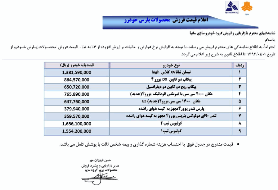 اقتصاد آنلاین - شرکت پارس خودرو قیمتهای جدید محصولات خود را با تعرفه های جدید در سال 93 اعلام نمود .
