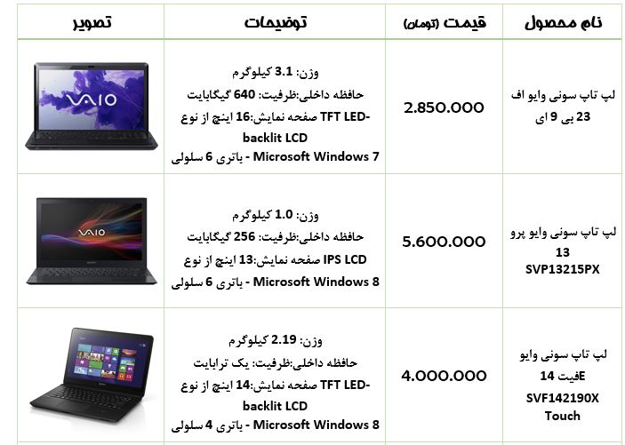 به گزارش مشرق، قیمت انواع لپ تاپ های سونی در بازار به شرح زیر است:
