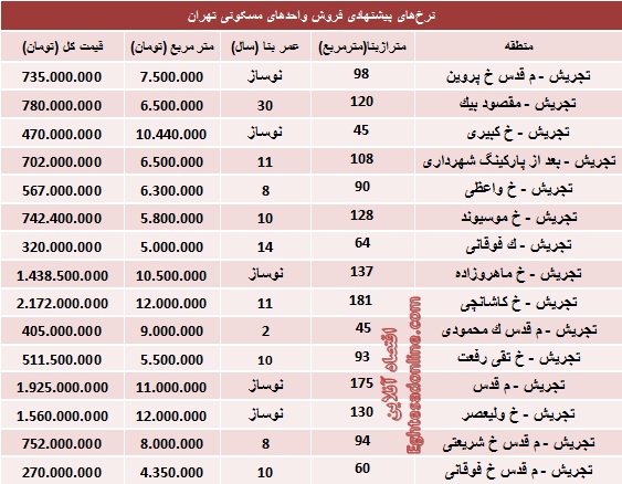 قیمت آپارتمان در تجریش تهران (+جدول)