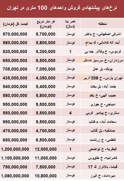 قیمت آپارتمان‌های 100 متری تهران (جدول)