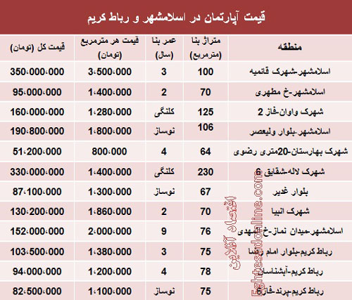 قیمت آپارتمان در اسلامشهر و رباط کریم (جدول)
