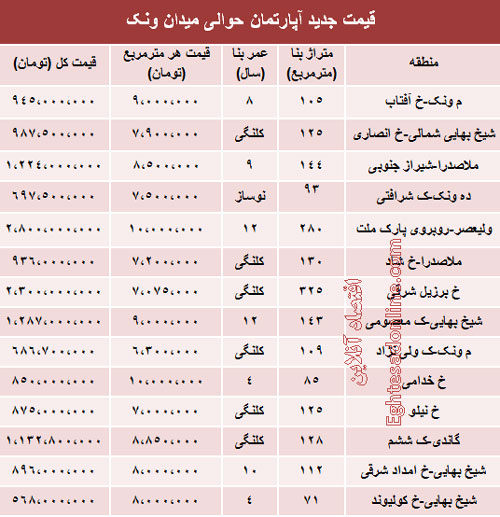 قیمت آپارتمان حوالی میدان ونک (جدول)