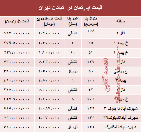 قیمت آپارتمان در اکباتان تهران (جدول)
