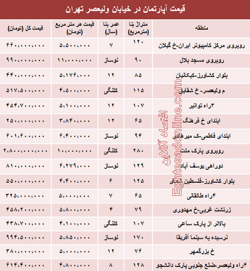 قیمت آپارتمان در خیابان ولیعصر تهران (جدول)