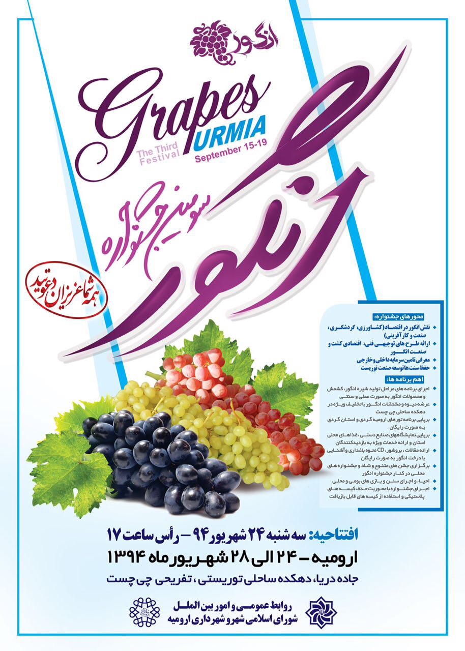 شهرداری ارومیه از پوستر جشنواره انگور ، رونمایی کرد. این جشنواره از 24 تا 28 شهریور در دهکده توریستی چی چست ارومیه برگزار می شود.