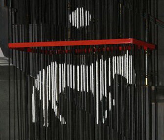 او ادامه داد: برشی قرمزرنگ بر پهنای طنابها به اثر، مفهومی خاص بخشیده، اما با توجه به اینکه آثار آنامورفوسیس نقطه خوانش خاص خود را دارند و مخاطب فقط در محدوده تعریفشده توسط هنرمند میتواند اثر را بهطور کامل درک کند، در این اثر نیز نقطهای برای خوانش درست اثر معین شده که از آن نقطه، جدایی نمادین خورشید از مرکب قابل دیدن است.