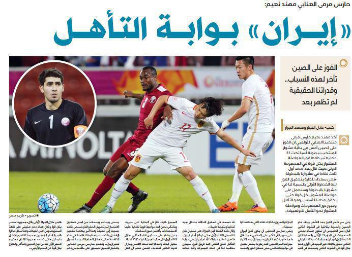 کاپیتان قطری‌ها در رابطه پیروزی ایرانی‌ها در بازی اول گفت: پیروزی ایران بر سوریه بر عنابی‌ها هیچ تاثیری نداشته است، ما زمانی که در برابر چین به میدان رفتیم از نتیجه آن بازی خبر نداشتیم و پس از بازی بود که متوجه شدیم ایران بازی را با دو گل به پیروزی رسید. هم اکنون هم نتیجه بازی‌مان در مقابل چین را فراموش کردیم و تمام تمرکز خود را روی بازی برابر ایران گذاشتیم.