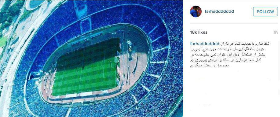 «شک ندارم با حمایت شما هواداران عزیز استقلال قهرمان خواهد شد چون هیچ تیمی را بیشتر از استقلال لایق این عنوان نمی‌بینم. جمعه در کنار شما هوادارن در استادیوم ازادی پیروزی تیم محبوبمان را جشن می‌گیریم»