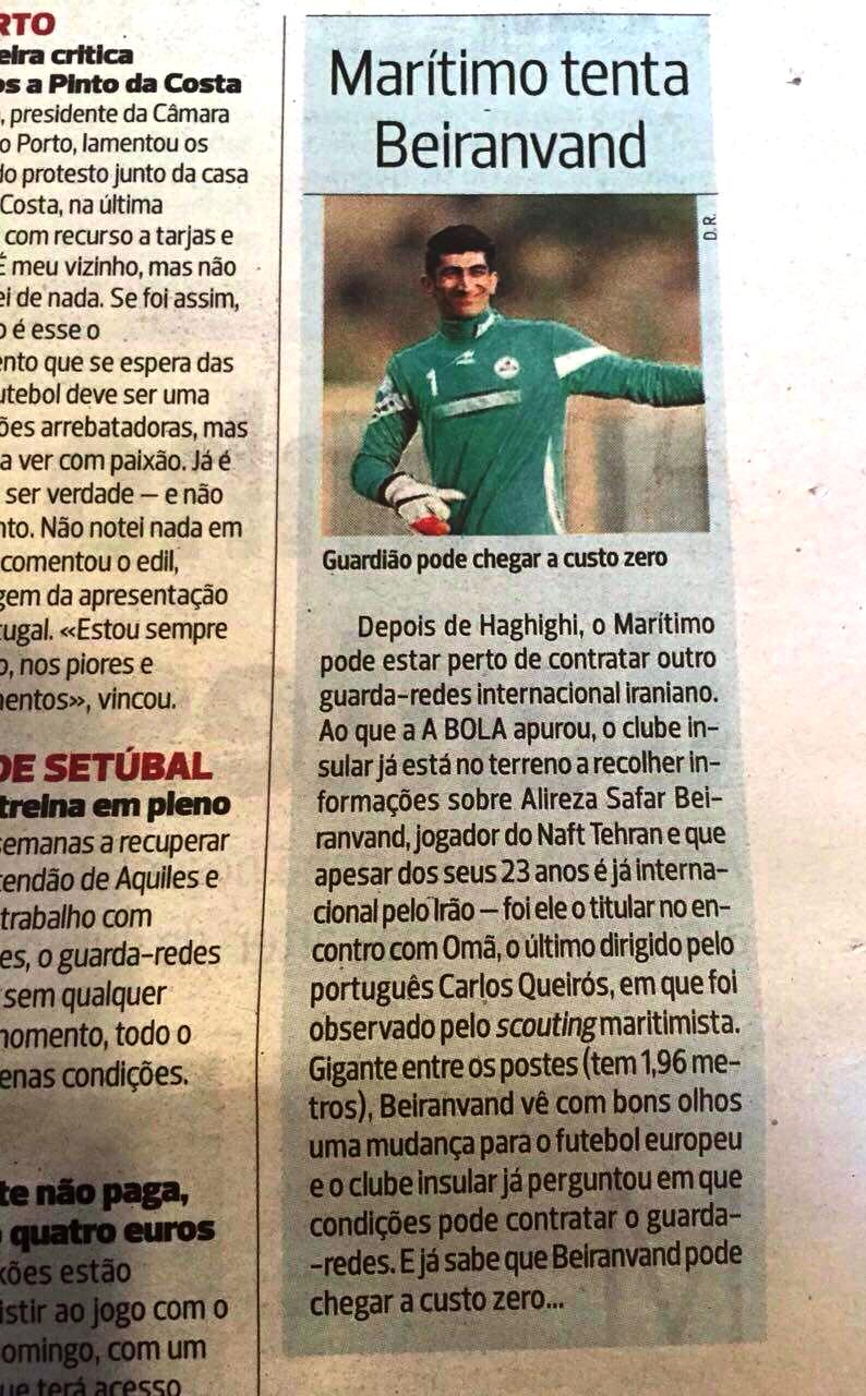 به نوشته نشریه ابولا که در پرتغال منتشر می شود تیم ماریتیمو در نظر دارد که علیرضا بیرانوند را نیز به کادر دروازه بانی خود اضافه کند.این در شرایطی است که در طول هفته قبل خبر کناررفتن حقیقی از تیم پرتغالی منتشر و تکذیب شد.
