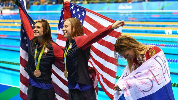 لیلی کینگ و کاتی میلی شناگران زن آمریکایی که در مسابقه 100 متر کرال سینه مقام اول و سوم را کسب کردند، هنگام رفتن به روی سکو برای دریافت مدال طلا و برنز خود با یولیا افیموآ، شناگر روس که به مقام دوم رسید، دست ندادند.