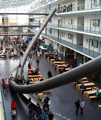 این سرسره شبیه دو بازوی آدم آهنی غول پیکر است که دانشجویان و اساتید را در عرض چند تانیه از طبقه بالا به کف زمین میرساند. بازوهای آهنینی که حسی از شادی و نشاط در فرد بوجود میاورند.