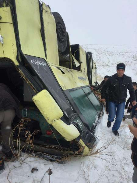 این اتوبوس پس از واژگونی در مسیر مخالف در ناهمواری کنار مسیر قرار گرفت.
