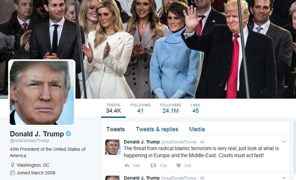 آخرین توییت ترامپ در صفحه رسمی اش @realdonald trump – تا لحظه تنظیم این گزارش – مطلبی درباره تهدیدات امنیتی ناشی از به گفته خودش " تروریسم افراط گرای اسلامی " است. ترامپ در ساعات نزدیک به نیمه شب دوشنبه – به وقت واشنگتن – توییت کرده : تهدید ناشی از تروریسم افراط گرای اسلامی بسیار واقعی است، فقط کافی است به آنچه که در اروپا و خاورمیانه اتفاق می افتد ، نگاه کنیم. دادگاه ها باید سریع اقدام کنند."