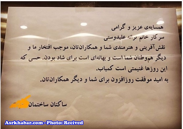 پیام تبریک همسایه های ترانه علیدوستی (عکس)