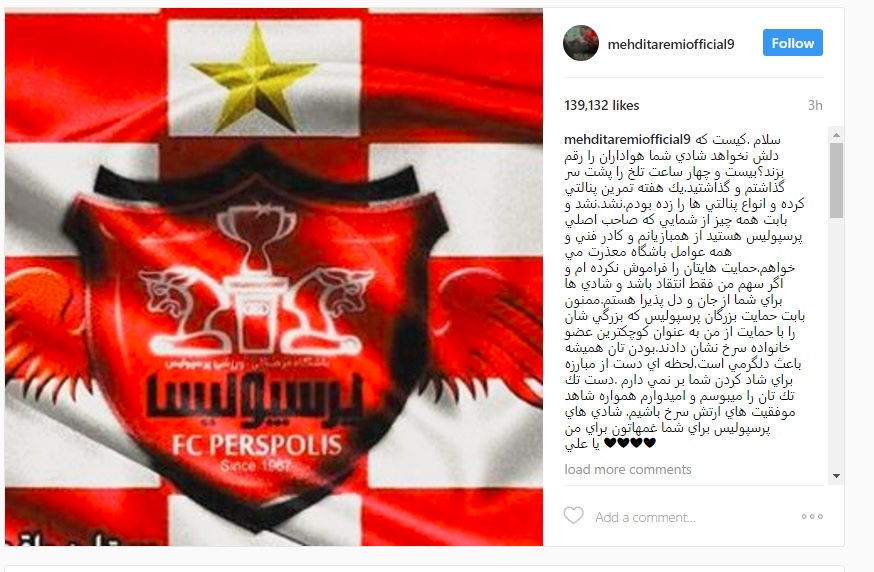 مهدی طارمی بابت گل نشدن پنالتی اش مقابل الریان از هواداران ، کادرفنی و بازیکنان پرسپولیس عذرخواهی کرد. مهاجم پرسپولیس که بابت گل نشدن پنالتی چیپ اش حسابی مورد انتقاد قرار گرفته بود با یک پست اینستاگرامی از همه عذرخواهی کرد.