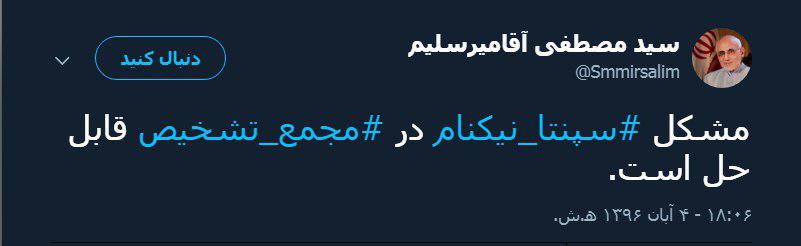 توئیت میرسلیم: مشکل سپنتا نیکنام (منتخب زرتشتی شورای شهر یزد) در مجمع تشخیص قابل حل است.