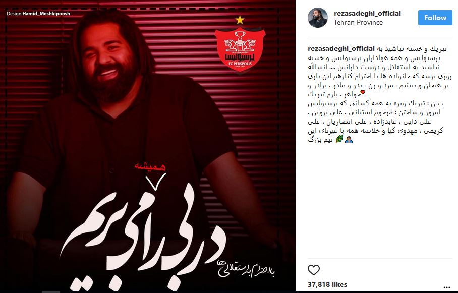 رضا صادقی با انتشار عکسی در اینستاگرامش پیروی تیم پرسپولیس در دربی را تبریک گفت.