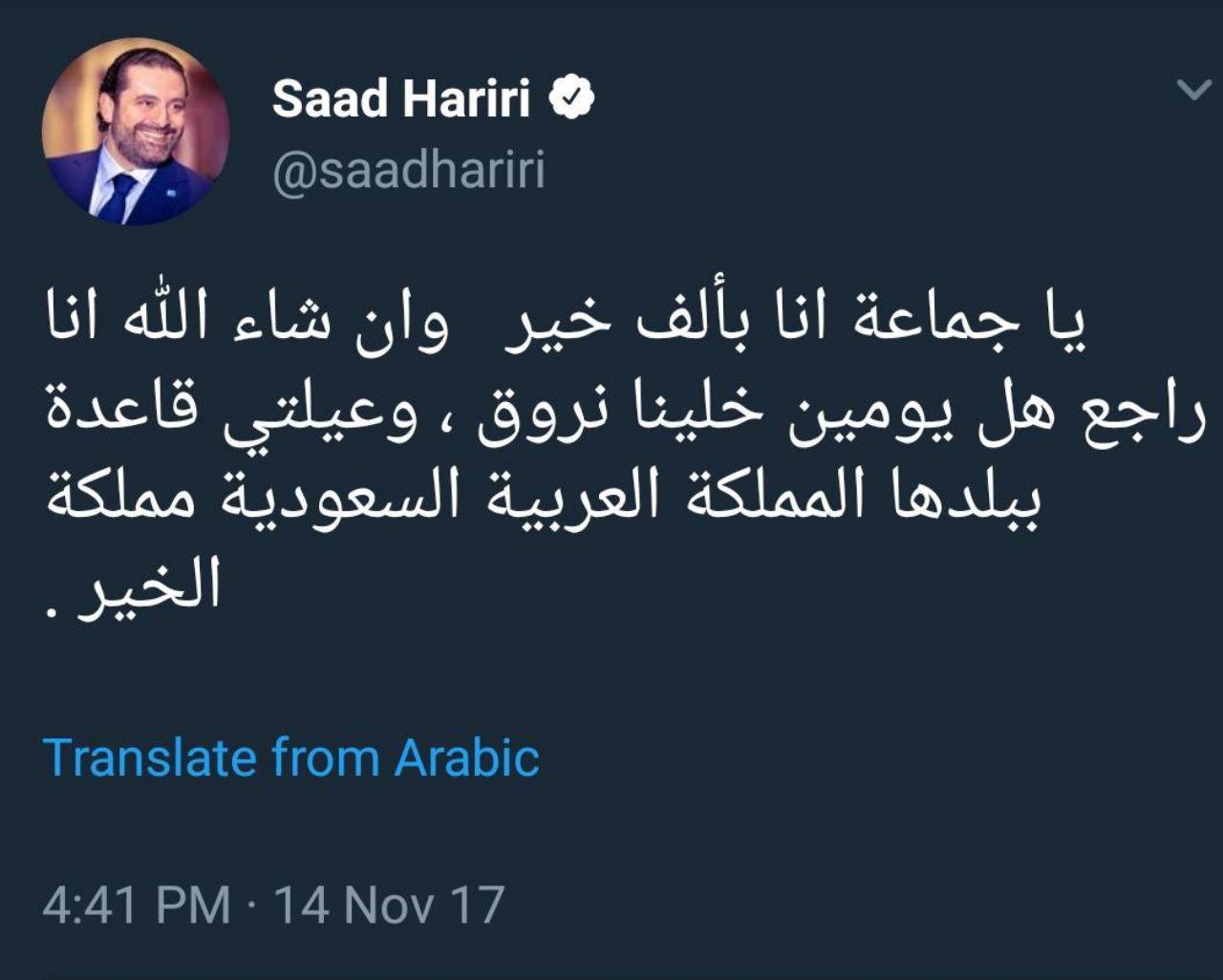 سعدحریری نخست وزیر مستعفی لبنان که در عربستان سعودی به سر می‌برد در توئیترش نوشت: حالم خوب است و ان‌شاء الله در دو روز آینده به کشورم بر می‌گردم/خانواده‌ام در عربستان سعودی باقی خواهند ماند.