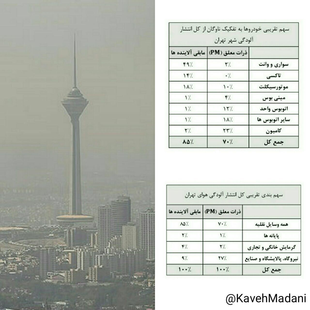کانال تلگرامی سازمان حفاظت از محیط زیست: بیش از ٧٠ درصد آلودگی هوای تهران مربوط به حمل و نقل و ترافیک است. اتوبوس ها و کامیون های فرسوده نقشی جدی در آلودگی هوای پایتخت بازی می کنند.