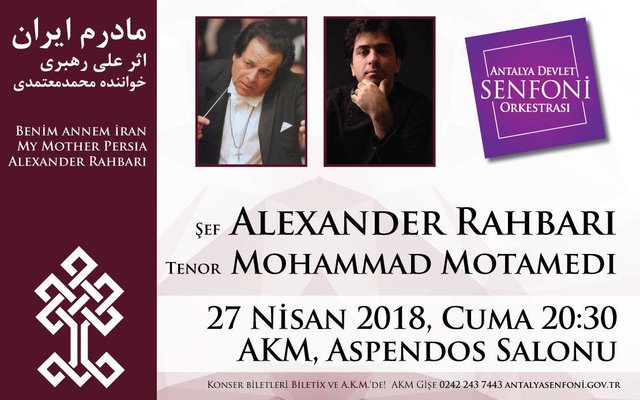 ارکستر دولتی آنتالیا از محمد معتمدی ـ خواننده آواز ایرانی ـ دعوت کرده است مجموعه سوییت‌های «مادرم ایران» را به رهبری «علی رهبری» در این شهر اجرا کند ذطز  .