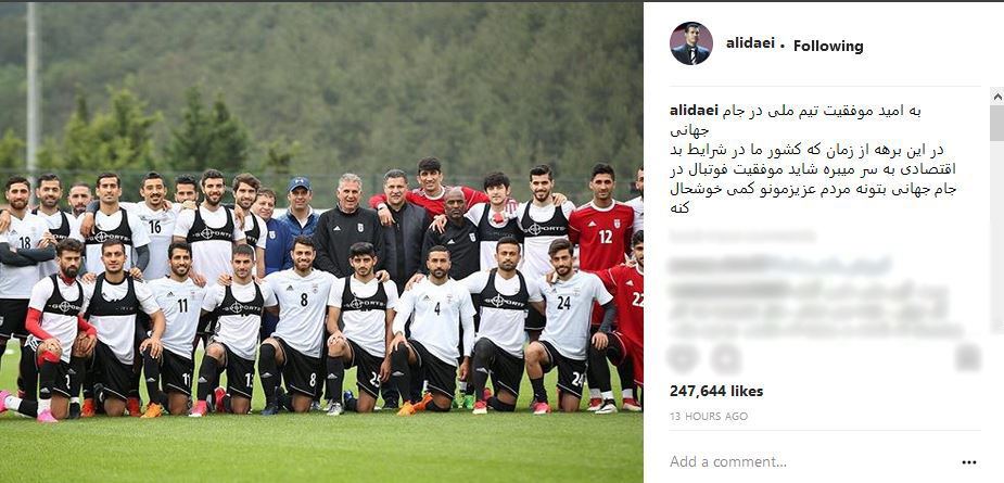 علی دایی پس از حضور در تمرین تیم ملی این عکس را در اینستاگرامش منتشر کرد: