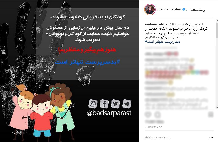 مهنار افشار در آخرین پست اینستاگرامش نوشت: با وجود این همه اخبار تلخ کودک ازاری تاخیر در تصویب «لایحه حمایت از کودکان و نوجوانان» هیچ توجیهی ندارد.همچنان پیگیر و منتظریم