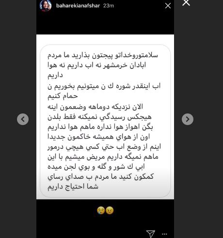 بهاره کیان افشار بازیگر سینما و تلویزیون در استوری اینستاگرامش پیام یک شهروند خوزستانی را منتشر کرد.
