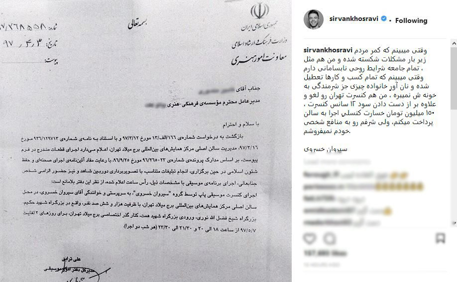 سيروان خسروي در يک اقدام جالب و متفاوت، 12 سانس کنسرتش را به دليل وضعيت بد معيشتي جامعه کنسل کرد و مجبور به پرداخت غرامت 150 ميليوني شد.