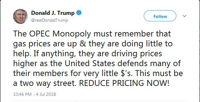 دونالد ترامپ در توئيتی اوپک را متهم کرده، قیمت نفت را در بازارهای جهانی افزایش داده است. او در این توئیت از اوپک خواسته است، برای کاهش بهای نفت تلاش کند.