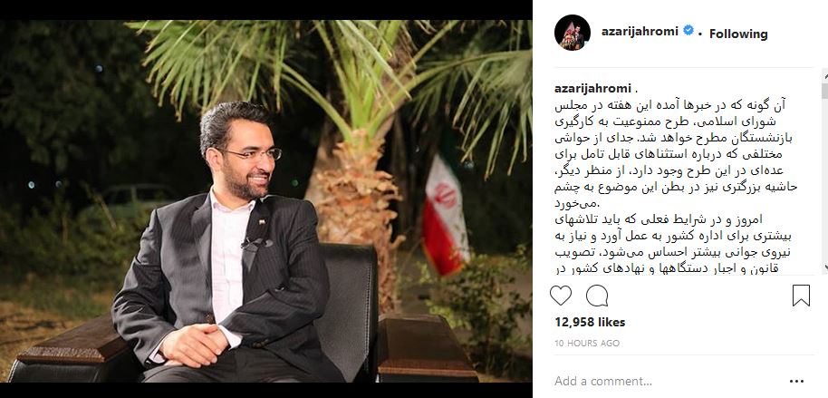 پست اینستاگرامی آذری جهرمی درباره طرح ممنوعیت به کارگیری بازنشستگان