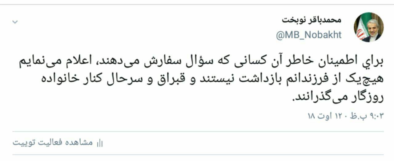 برای اطمینان خاطر آن کسانی که سوال سفارش میدهند اعلام مینمایم هیچ یک از فرزندانم بازداشت نیستند و قبراق و سرحال کنار خانواده روزگار میگذرانند.
