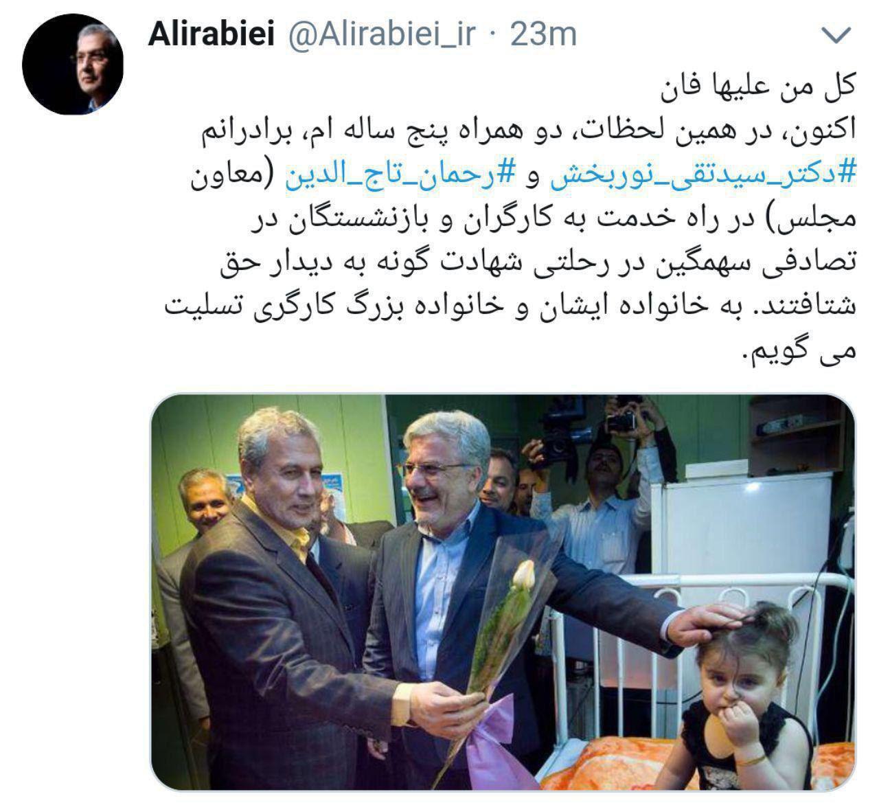 علی ربیعی وزیر سابق رفاه به درگذشت سیدتقی نوربخش مدیرعامل سازمان تأمین اجتماعی و معاونش رحمان تاجالدین واکنش نشان داد و نوشته است: نوربخش، نیمی از حقوق خود را به بیتالمال برمیگرداند.