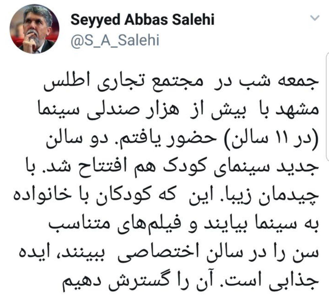 وزیر فرهنگ و ارشاد اسلامی در حاشیه حضورش در افتتاح اولین سینمای کودک کشور در توییترش نوشت:« جمعه شب در مجتمع تجاری اطلس مشهد حضور یافتم. دو سالن جدید سینمای کودک هم افتتاح شد. این که کودکان با خانواده به سینما بیایند و فیلم‌های متناسب سن را در سالن اختصاصی ببینند، ایده جذابی است. آن را گسترش دهیم.»
