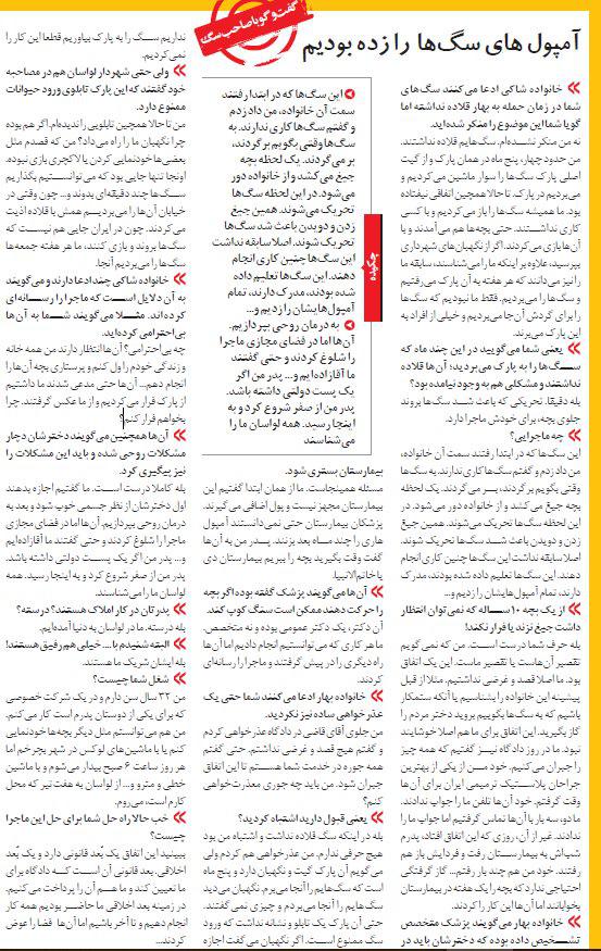 - بله حرف شما درست است. من که نمیگویم تقصیر آنهاست یا تقصیر ماست. این یک اتفاق بود. ما اصلا قصد و غرضی نداشتیم. مثلا از قبل پیشینه این خانواده را بشناسیم یا آنکه ستمکار باشیم که به سگها بگوییم بروید دختر مردم را گاز بگیرید. این اتفاق برای ما هم اصلا خوشایند نبود. ما در روز دادگاه نیز گفتیم که همه چیز را جبران میکنیم. خود من از یکی از بهترین جراحان پلاستیک ترمیمی ایران برای آنها وقت گرفتم. خود آنها تلفن ما را جواب ندادند. ما دو، سه بار با آنها تماس گرفتیم اما جواب ما را ندادند. غیر از آن، روزی که این اتفاق افتاد، پدرم شباش به بیمارستان رفت و فردايش باز هم رفتند. خود من هم چند بار رفتم... گاز گرفتگی احتیاجی ندارد که بچه را یک هفته در بیمارستان بخوابانند اما آنها این کار را کردند.