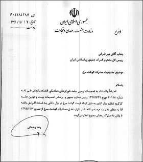رضا رحمانی طی نامه‌ای به مهدی میر اشرفی اعلام کرده که "با استناد به تصمیمات نهمین جلسه شورای عالی هماهنگی اقتصادی ابلاغی طی نامه رئیس جمهور و بر اساس تصمیمات بیست و دومین جلسه کارگروه تنظیم بازار کشور به دلیل اینکه قیمت گوشت مرغ در بازار داخلی به شدت افزایش پیدا کرده است؛ بنابراین به منظور مدیریت عرضه و تقاضا در بازار داخل صادرات گوشت مرغ از ابتدای اسفند تا پایان ماه مبارک رمضان ممنوع اعلام می‌شود".
