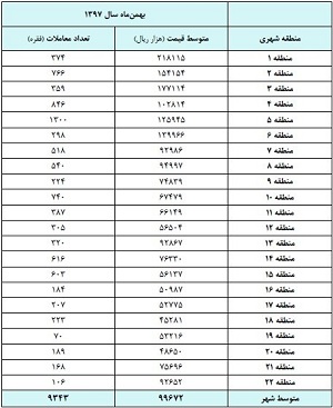 بر اساس گزارش بانک مرکزی در میان مناطق ۲۲ گانه شهرداری تهران بیشترین متوسط قیمت یک متر مربع زیربنای مسکونی معامله شده معادل ۲۱ میلیون و ۸۱۱ هزار تومان به منطقه یک و کمترین آن با چهار میلیون و ۵۲۸ هزار تومان به منطقه ۱۸ تعلق داشته است که ارقام مزبور نسبت به ماه مشابه سال قبل به ترتیب ۸۹.۱ و ۸۶.۷ درصد افزایش یافته‌اند.
