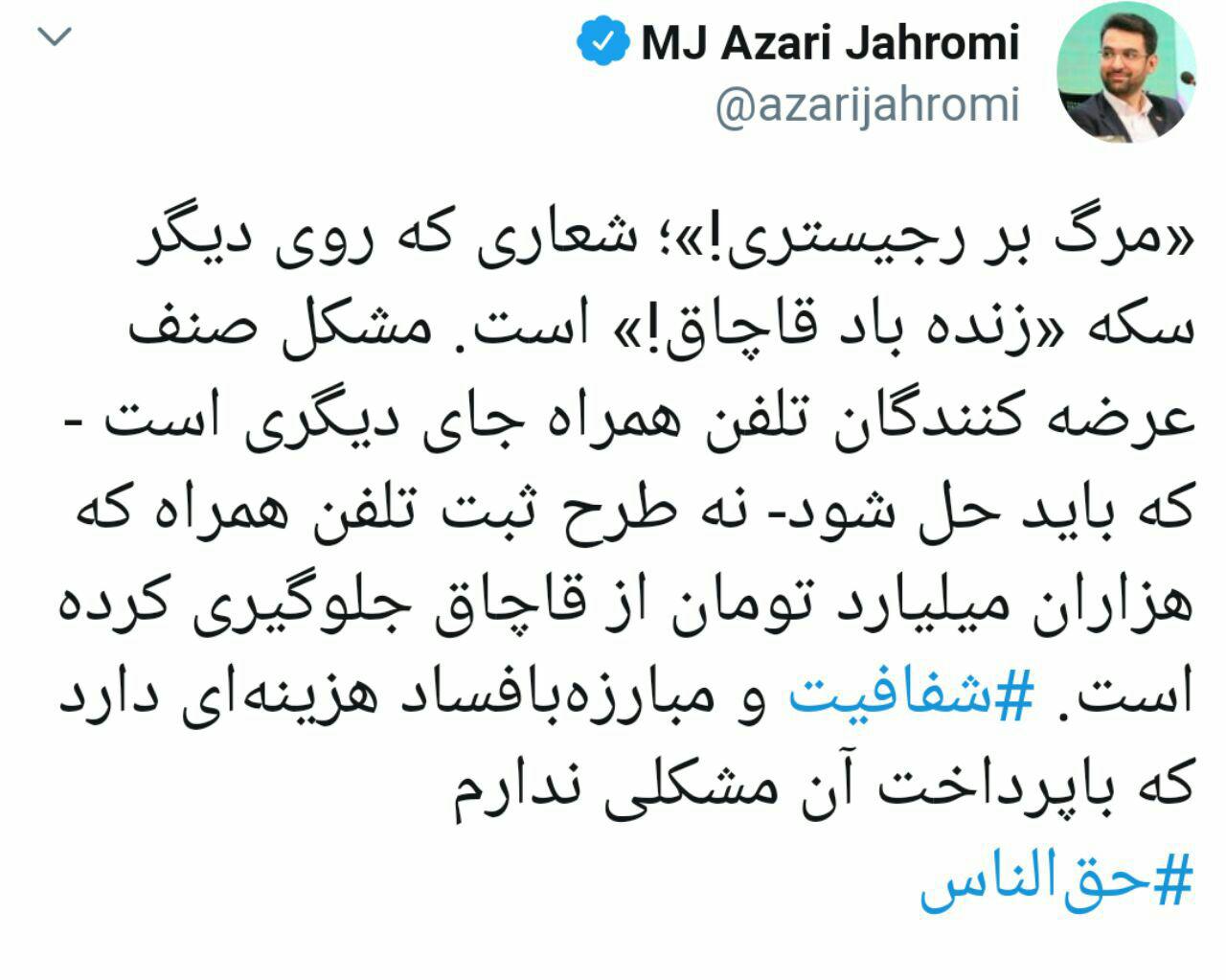 وزیر ارتباطات: مرگ بر رجیستری شعاری که روی دیگر سکه زنده باش قاچاق است