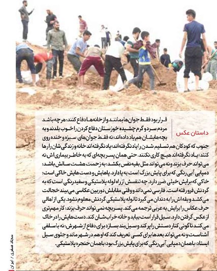 سیل قرار است بیاید و خانه خرابشان کند. دستهایش را در خاک میکند تا گونی کنار دستش را پر کند و سیلبند بسازد برای دفاع از شهرش؛ نه با سلفی آشناست و نه میتواند بعدها برای کسی تعریف کند که او هم در شهر ماند و جلوی سیل ایستاد؛ با همان دمپایی آبی رنگی که برای پایش بزرگ بود؛ با همان حنجره پلاستیکی.
