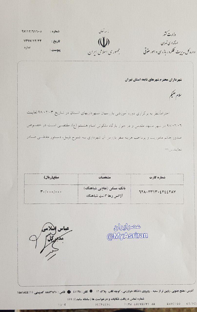 نامه استانداری تهران به شهرداران استان: 3 میلیون تومان به حساب یک آژانس واریز کنید تا در مشهد دوره 3 روزه برگزار کنیم (+عکس)