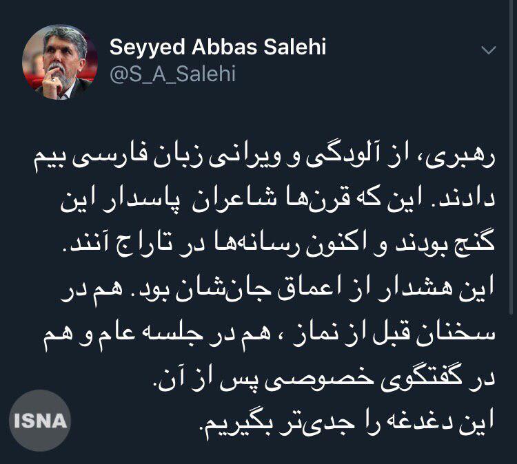 توییت وزیر ارشاد از دغدغه مقام معظم رهبری درباره "آلودگی و ویرانی زبان فارسی"