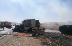 به گزارش ایسنا، صبح جمعه 24 خرداد، براثر برخورد یکدستگاه نیسان با یک دستگاه تانکر حامل بنزین، تانکر آتش گرفته و چهار سرنشین این خودرو به همراه یک سرنشین نیسان، کشته شدند.