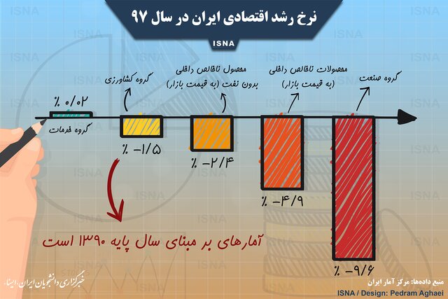 نرخ رشد اقتصادی ایران در سال ۹۷ در گروه صنعت منفی ۹/۶ درصد، در رده محصولات ناخالص داخلی (به قیمت بازار) منفی ۴/۹ درصد و محصول ناخالص داخلی بدون نفت (به قیمت بازار) منفی ۲/۴ درصد است. مرکز آمار ایران این آمارهای بر مبنای سال پایه ۱۳۹۰ را منتشر کرده و در این اینفوگرافی به رشد اقتصادی این گروهها پرداخته شده است.
