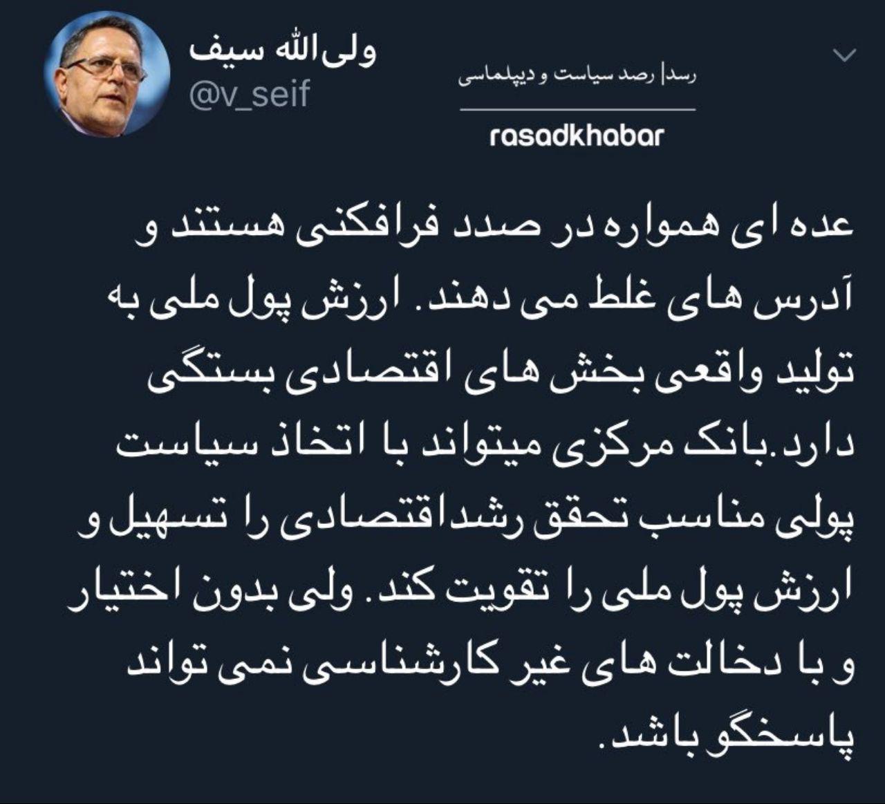 سیف: بانك مركزى بدون اختيار و با دخالت هاى غيركارشناسى نمى تواند پاسخگو باشد