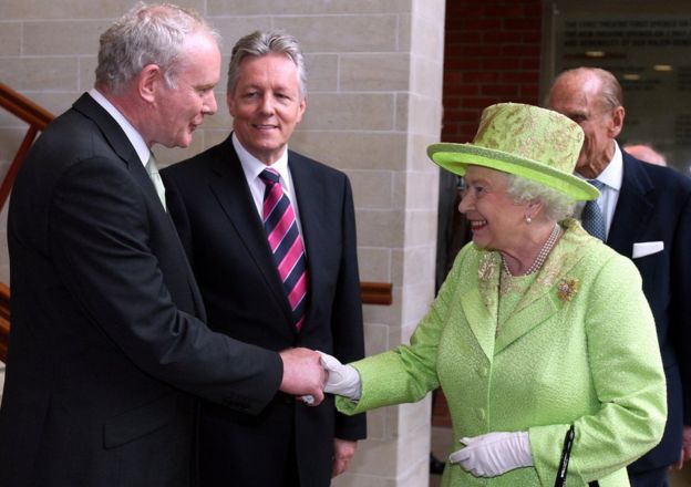 ملکه بریتانیا و مارتین مکگینس تابستان سال ۲۰۱۲ برای اولین بار با هم روبرو شدند و دست دادند.